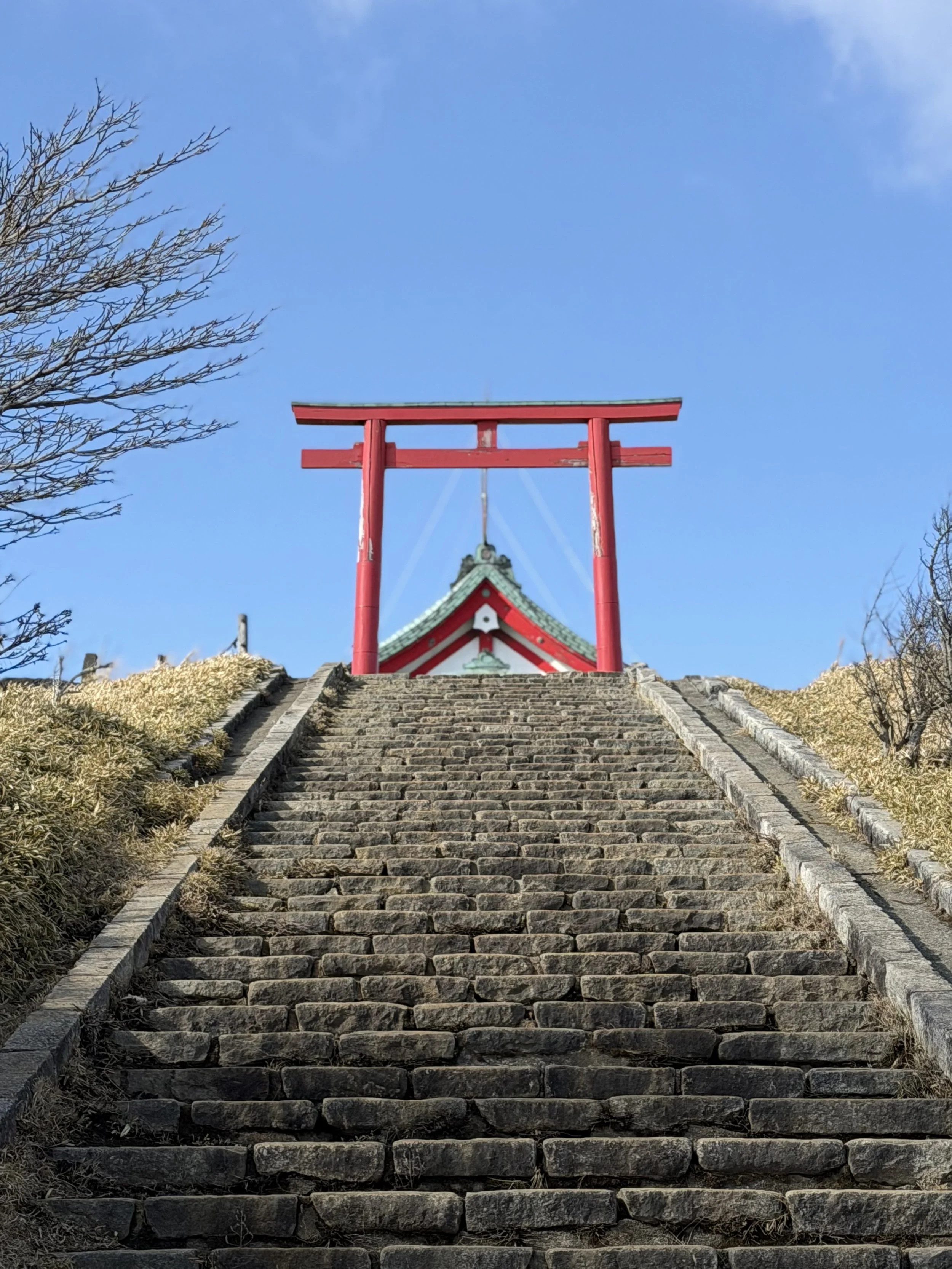 A striking torii gate overlooking the volcanic landscapes of Hakone.
