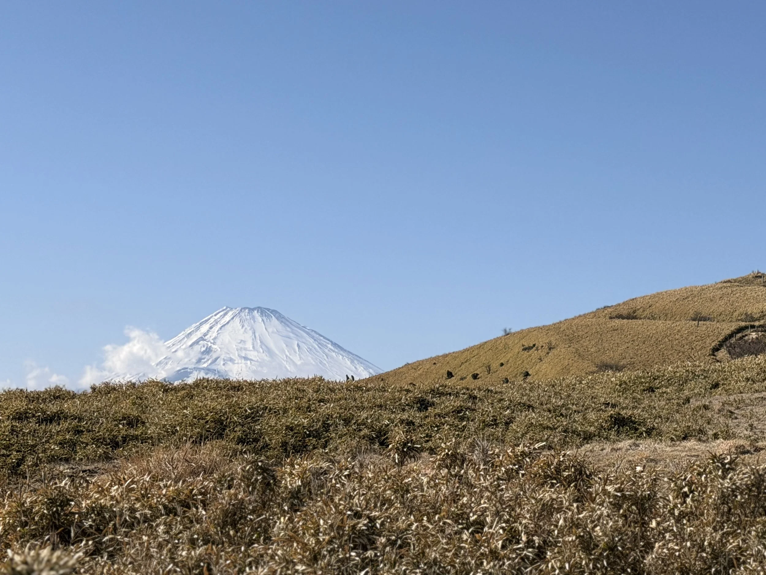 A quiet path leading through Hakone’s volcanic mountains with distant views of Mount Fuji.
